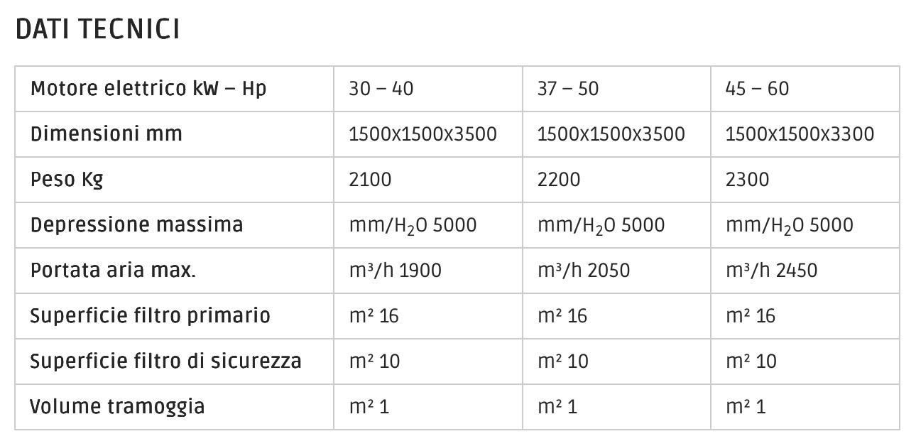 L'aspiratore è fornito di serie con alimentazione elettrica V 400 trifase, differenti alimentazioni elettriche possono essere richieste .